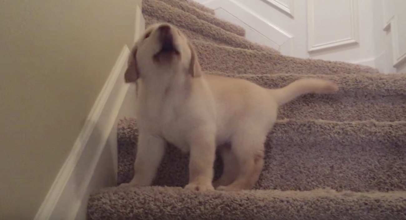 「これが噂の階段か…コワッ」絶望と喜びに包まれた、ゴールデン子犬の階段チャレンジ【動画】