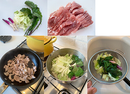 豚肉は、2cmくらいに切って豚肉自身の脂で焦がさないようにソテー。野菜は沸騰した湯でさっと5秒くらい湯がいてざるに取ります。