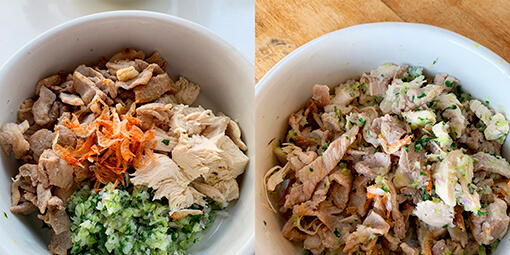 昨夜の残りの鶏むね肉を茹でたものを足し、カルシウム補給のためにピヨカルと桜えびの素干しも加えて出来上がり。
