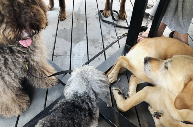 愛犬と一緒に友人たちとカフェでおしゃべり。犬話は尽きることがありません