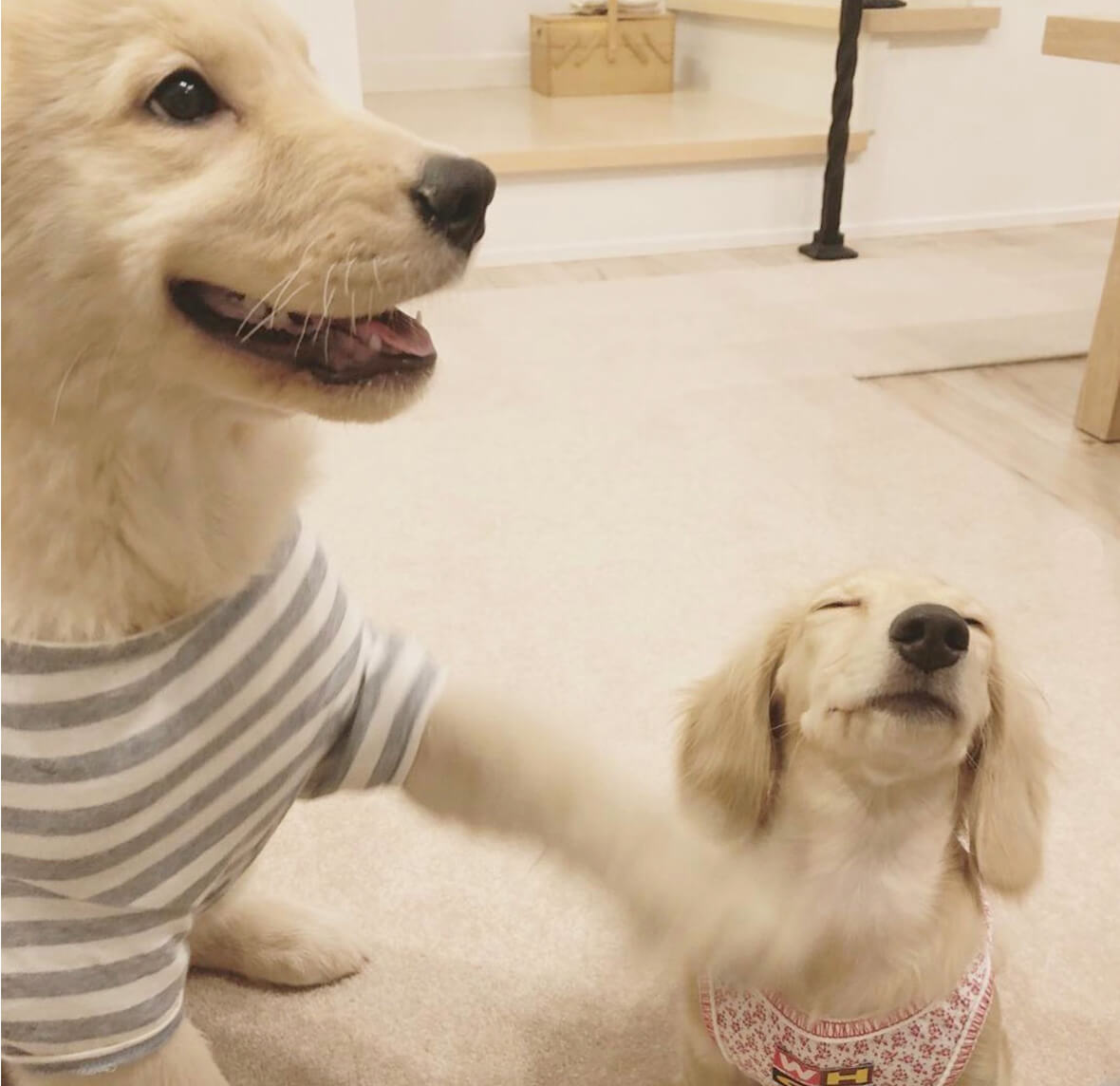 「あ! ごはんの時間?」とお姉さんのダックスフンドのはなさんとやってきたのは、ゴールデンレトリーバーのゆきさん。はなさんの横で、「あのね、見ててね」と一生懸命お手・おかわりの練習をしています。飼い主さんが何も言っていないのに、自主的にやりはじめたそうです。素晴らしい!