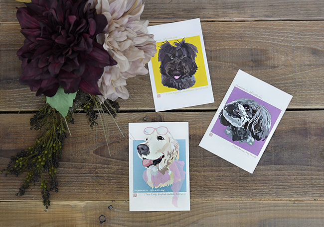 私はすでに愛犬3頭全員を描いてもらっており、オプションでポストカードやグリーティングカードも作りました。表情から毛の流れまでそれぞれの個性を見事に捉えていて、性格まで手に取るようにわかるようなのです。