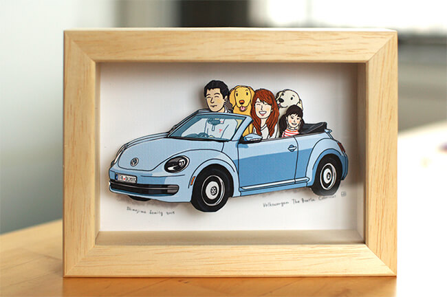 家族全員で夢のドライブ。こちらはポップアップアートボックスという立体的なイラストです。写真提供:きみしまゆきこ