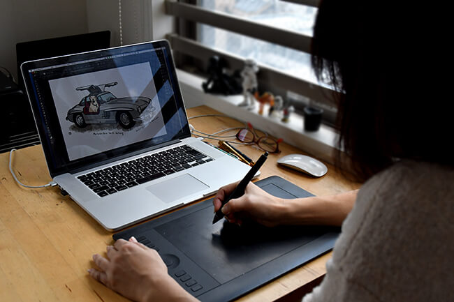 「いただいた写真を見ながらあまり細かくリアルになりすぎないようにPCで描いていきます。テイストは確立していますが、バランスを取るのに必要なのは引き算ですね。ただし目だけはリアルに近くなるように描いています。」