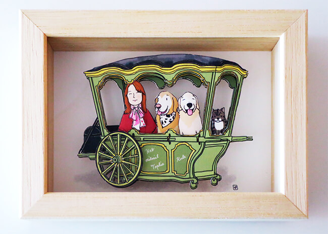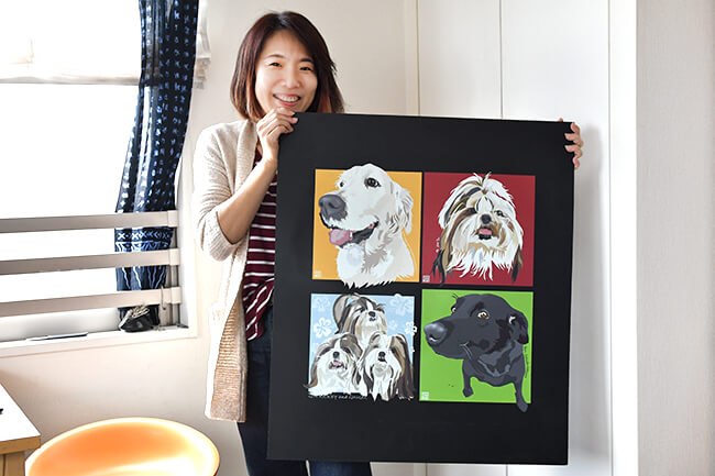 「いつか個展を開きたいと思っています。でもオーダーではない既成の作品を購入していただくより、オーダーでそれぞれの方へ思いを込めて描いた作品をお渡しして喜んでもらえる方が、私には合っているし作り甲斐があると感じています。特にポップアップアートは作るのが大変ですが、その1枚に物語があり世界観が作りやすいので、一番おすすめしたい商品です。レトリーバーは絵になるのでみなさんぜひオーダーしてください。待っています!」