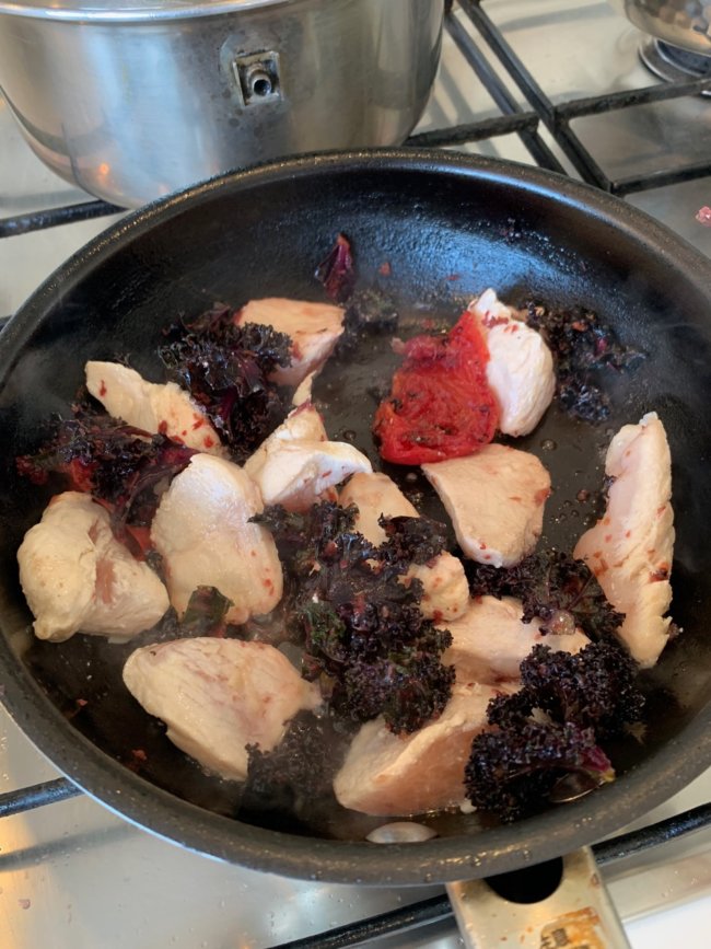 フライパンにオリーブオイルを少しひき、先ほどのケールとトマトをソテーし、そこに乳酸菌を塗ってラップで密封して10日ほどおいておいた鶏肉と豚肉を適当にカットして一緒にソテー。