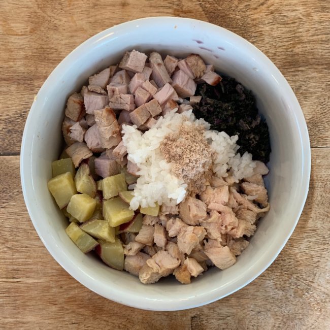 白飯と柔らかく茹でたサツマイモ、ミネラルがたっぷりのふりかけを加えて出来上がり。