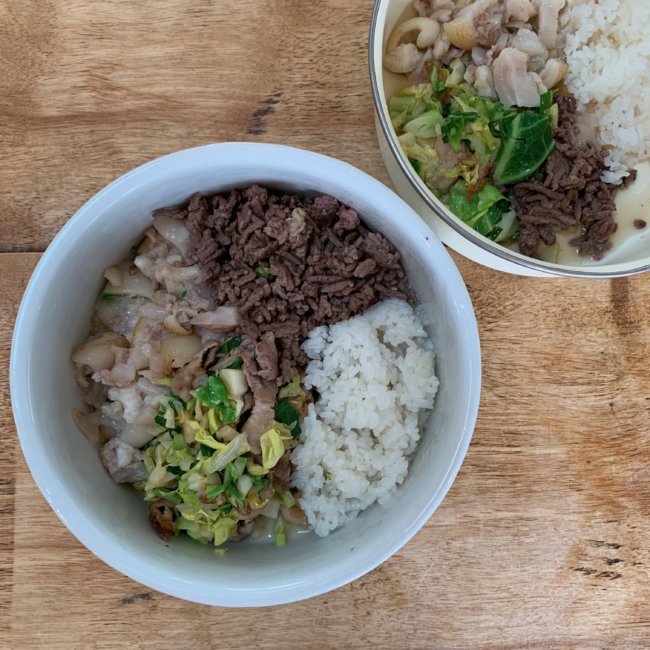 牛肉そぼろ、キャベツ、豚肉、ご飯と一緒に、カルシウムをピヨカルで補給して。(ピヨカルは、キッチンドッグ!で販売している卵殻カルシウムです。)