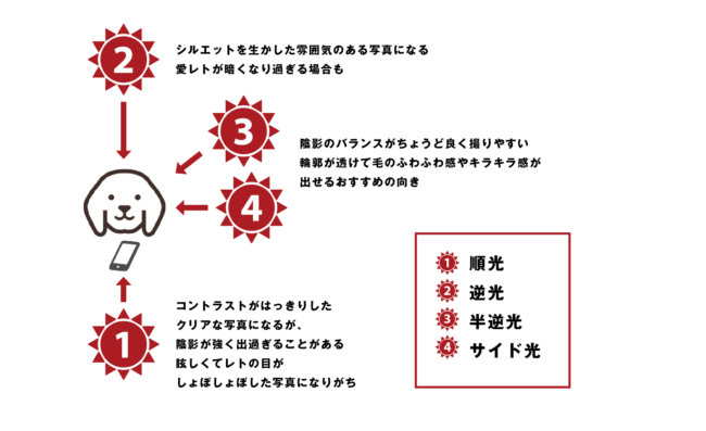 「4.逆光」も雰囲気が出ておすすめなのですが、フラットや黒ラブなど色が暗めの子の場合は顔が黒く潰れてしまうことがあるのでバランスを見ながら光の向きを変えてください。