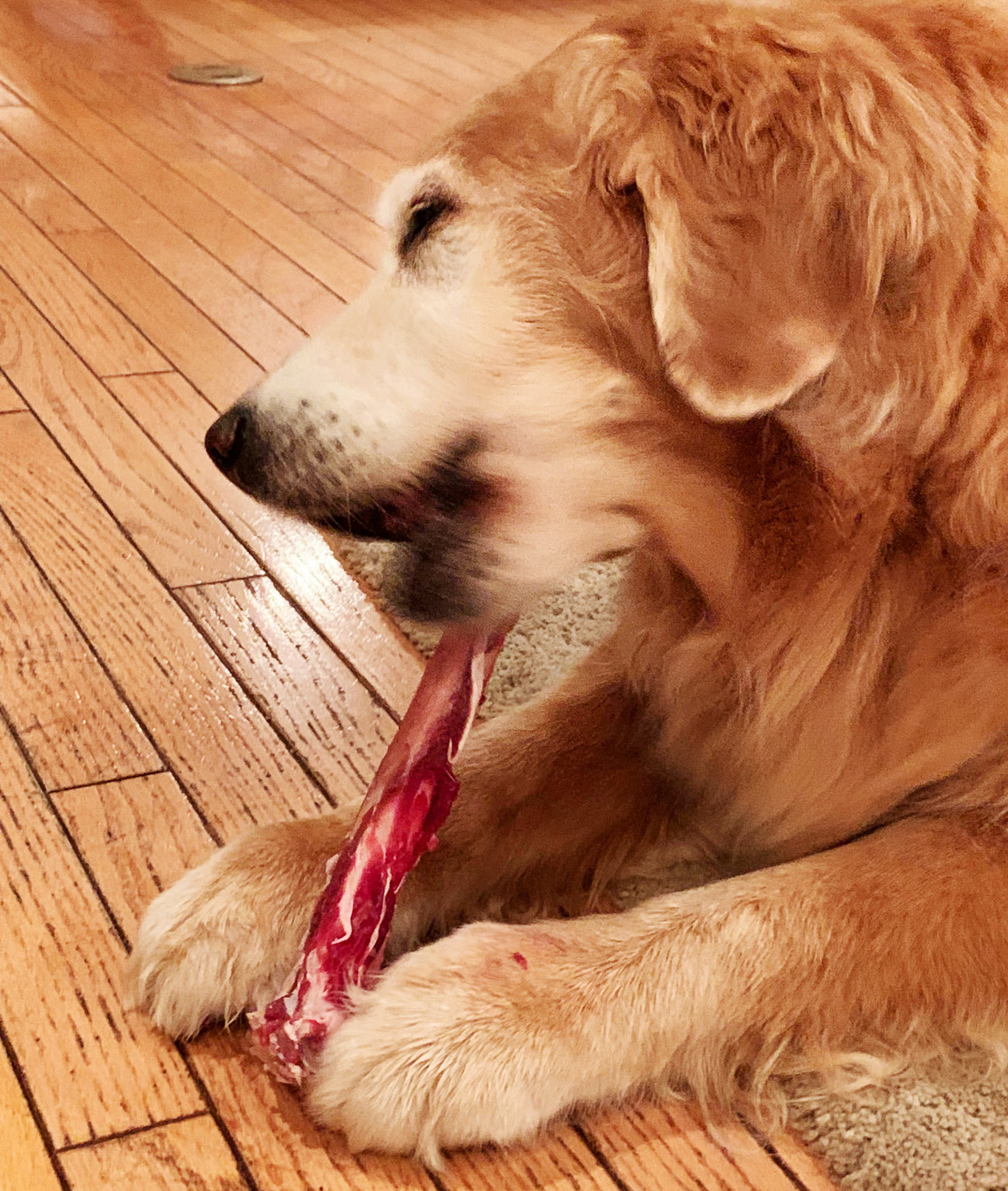 ベランダとかで齧ってくれればよいのですが、家の中で骨を齧ると床が汚れるしなー、なんて、私の都合もあるんですが…。