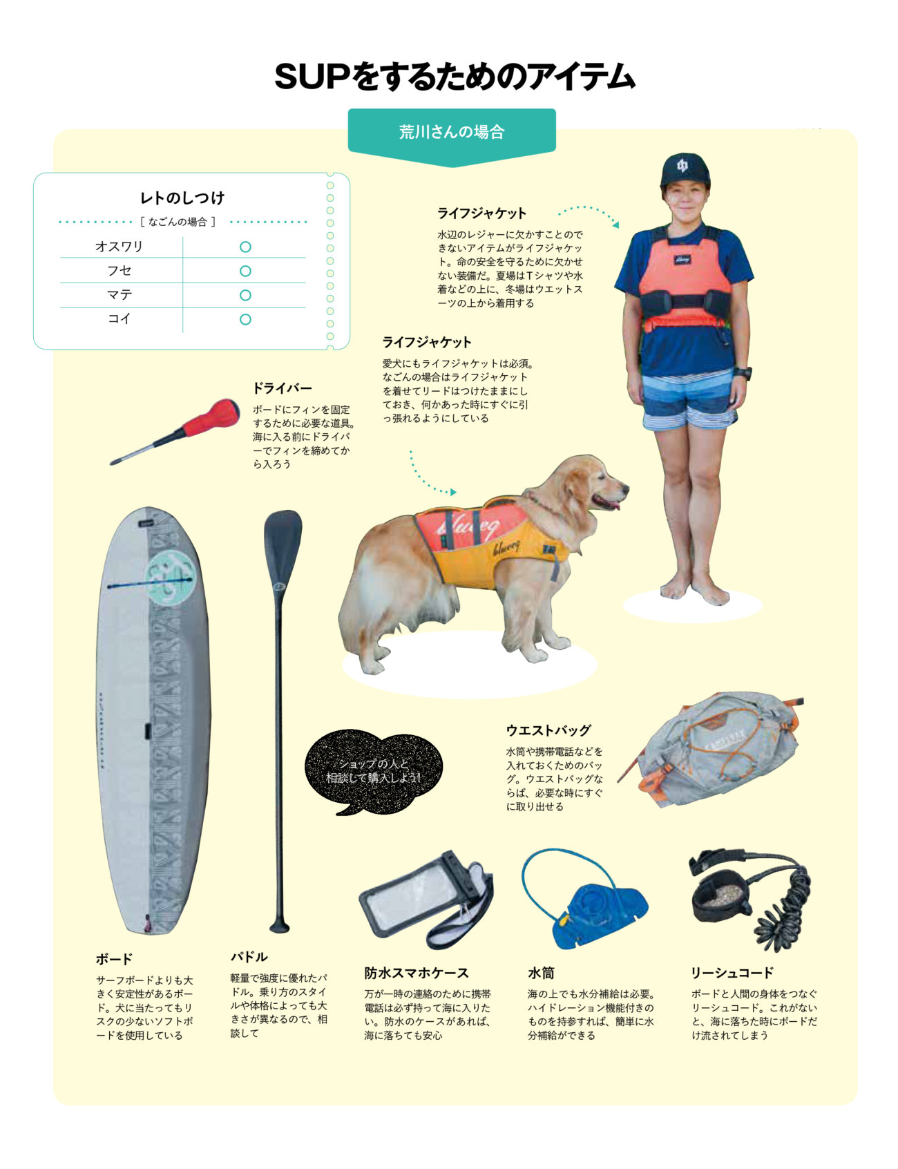 SUPに必要なボードとパドル、リーシュコードの他、初心者の場合は飼い主も犬もライフジャケットをつけて海に入りたい。
