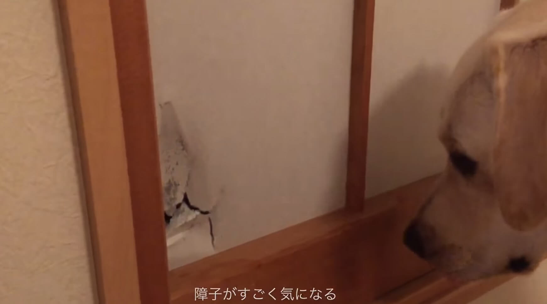 やさしくバウを障子から離していますが、バウの方は「でも気になるんだよねぇ」とばかりにずっと同じ場所をクンクン。