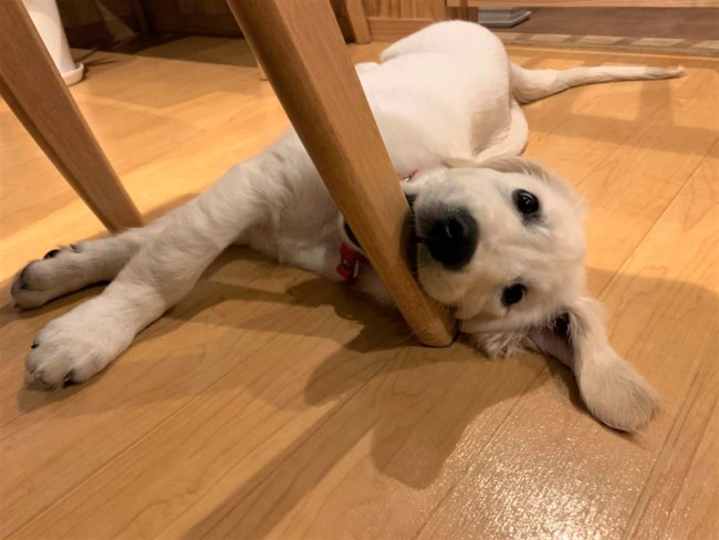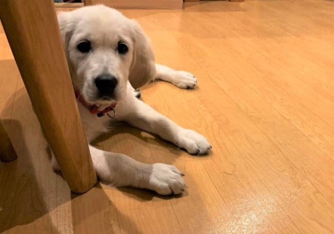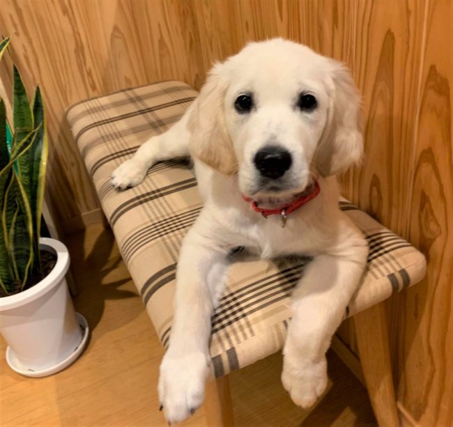 そこで、初心に戻ってブリーダーのもとにいるゴールデンを探し始めたところ、きなこちゃんにそっくりな母犬のもとで生まれた英国ゴールデンの子犬にめぐりあったそうです。