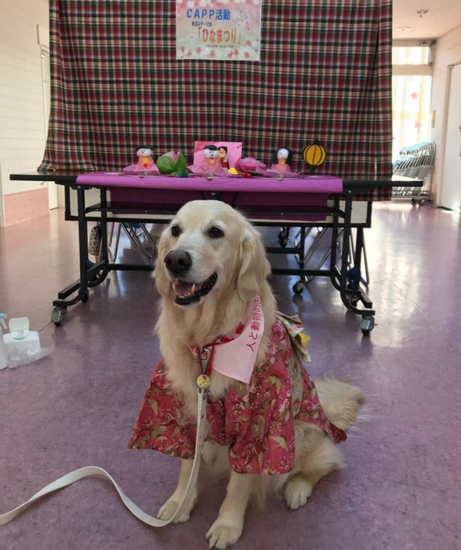 8歳からスタートした、JAHA(公益社団法人 日本動物病院協会)の“人と動物のふれあい活動(CAPP コンパニオン・アニマル・パートナーシップ・プログラム)”では、きなこちゃんは持ち前の明るさとやさしさで、多くの入所者の方を笑顔にしたそうです。