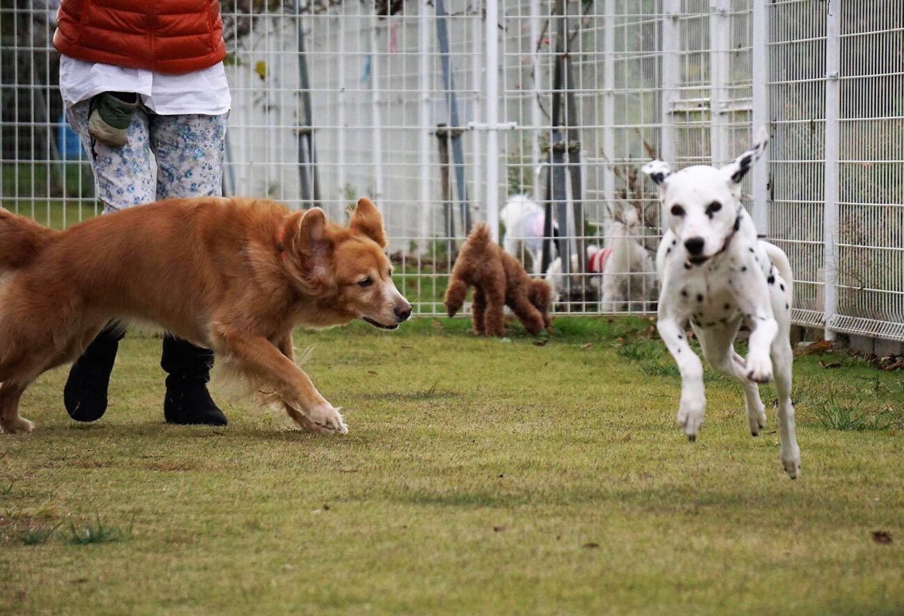 ドッグランで遊ぶフランちゃんと元保護犬のエリーちゃん