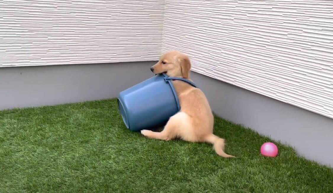 (コテンッ)お気に入りのバケツに絡まって尻餅ついちゃうゴルパピーが愛らしい!【動画】
