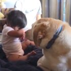 やんちゃな子犬に優しく寄り添い、大きな心で受け入れてくれたゴールデン。【ほっこり動画】